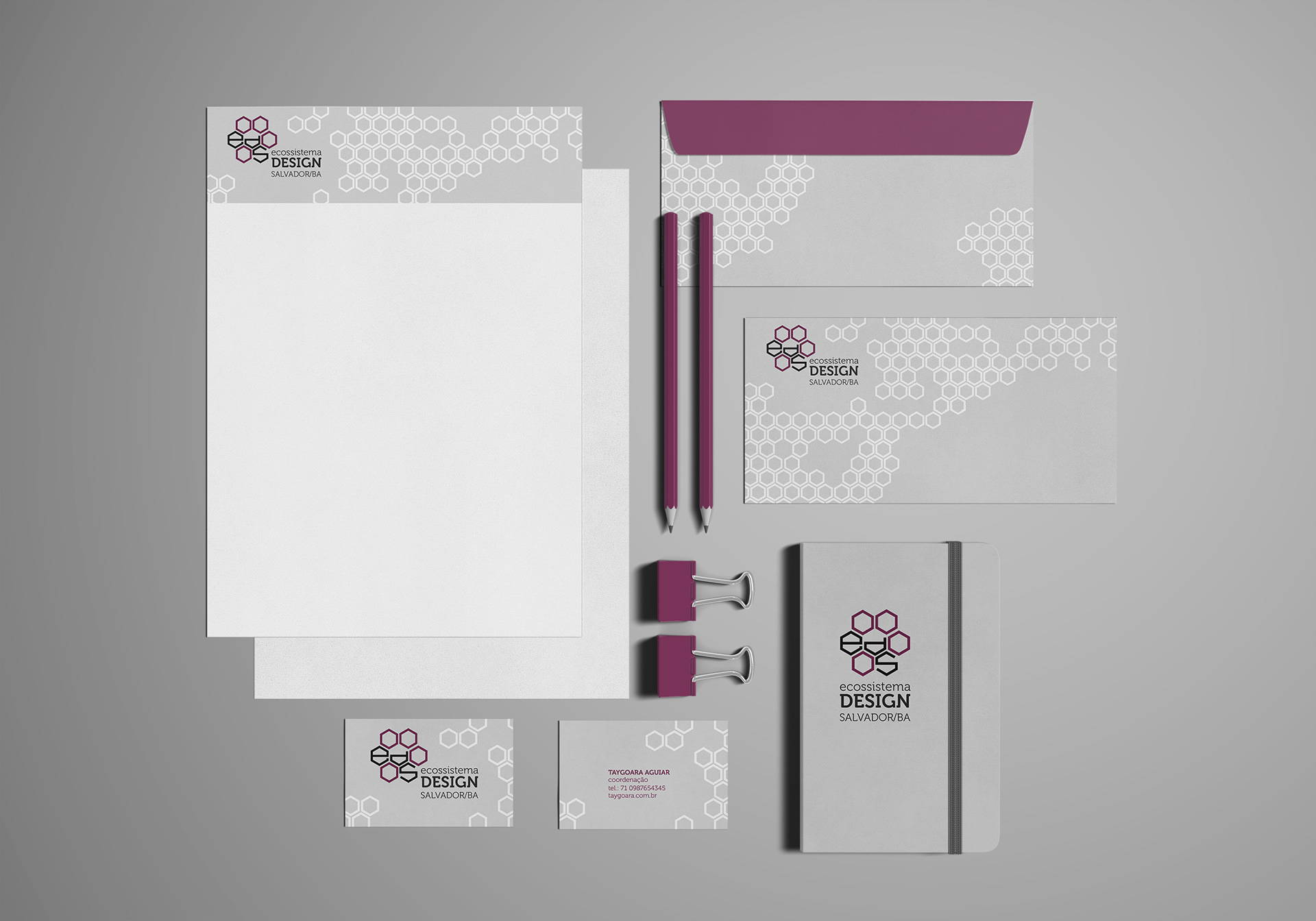 A identidade da pesquisa ECOSSISTEMA DESIGN EM SALVADOR/BA parte de conceitos como " circularidade", "coletividade", "colmeia" e "conectividade" e busca representar graficamente essas palavras chave a partir da organização circular de hexágonos. Estes elementos geométricos atuam, por sua vez, como células fundamentais para o grid de construção da marca e o partido gráfico da identidade visual. A marca foi concebida tendo em vista a necessidade de transitar entre os diferentes segmentos do ecossistema de Design de Salvador e Região Metropolitana, sejam eles alternativos, acadêmicos ou tradicionais. Por esse motivo, inspira-se formalmente em referenciais modernistas e aposta na harmonia proporcionada por um grid clássico, construído a partir da proporção áurea. A paleta cromática e o partido gráfico flexível facilita as aplicações e agrega dinamismo e contemporaneidade para a identidade do projeto, sem deixar de contemplar seu caráter institucional.