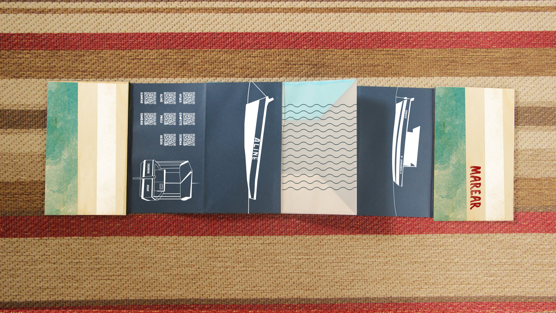 Marear é uma cartografia afetiva composta por imagens de embarcações pesqueiras e de passeio dos portos de Plataforma, Solar do Unhão, Porto da Barra e Ilha de Maré, localizados na Baia de Todos os Santos, em Salvador/BA. Sua estrutura de madeira e papéis especiais, ao mesmo tempo é e abriga barcos e cianotipias sobre papel de algodão. Marear é um convite à invenção de narrativas e histórias possíveis dos barcos de fibra ou madeira presentes neste livro de artista. Naus que compõem a paisagem de grande parte da orla marítima da cidade e representam os barcos presentes nos espaços íntimos das minhas memórias. Memórias afetivas construídas, durante minha infância e adolescência, no subúrbio ferroviário e Ilha de Maré; e mais recentemente, nas vivências entre os barcos do centro antigo da cidade. O projeto gráfico parte de fotografias dos barcos de transporte e pesca da Baía de Todos os Santos e os seus respectivos nomes de batismo. Uma investigação gráfica e tridimensional expressa nas texturas, cores e tipografias presentes nas próprias embarcações registradas.